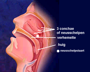 De neusschelpen of “conchae” zijn 3 luifels die in iedere neusgang te vinden zijn. Ze zijn bekleed met slijmvlies of mucosa. Door hun grote oppervlakte bieden ze een uitgebreid contact aan de lucht die er passeert bij het inademen. Dat is heel belangrijk, want daardoor wordt de lucht bevochtigd, verwarmd en gezuiverd voor ze in de luchtpijp en de longen komt.