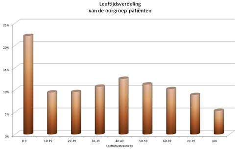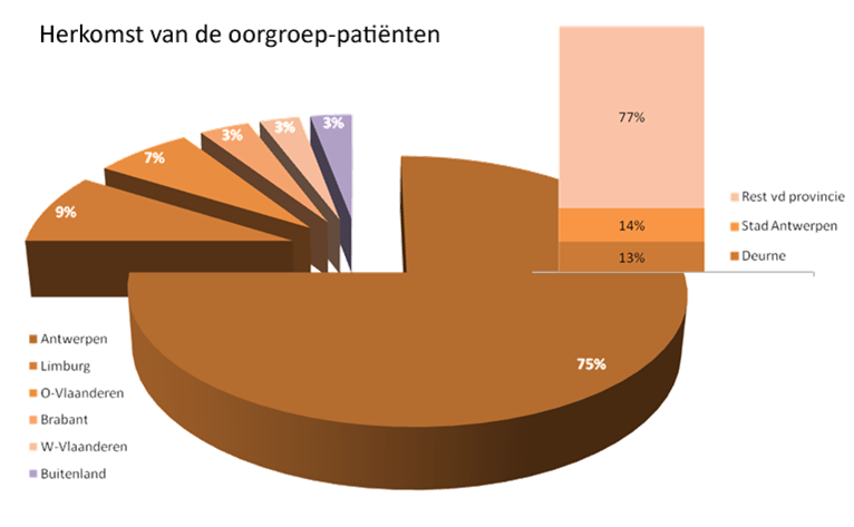 De patiënten van de oorgroep komen vanuit gans Vlaanderen en daarbuiten (zie onderaan voor grafiek).  De patiënten zijn van alle leeftijden (zie onderaan voor grafiek). Door de bijzondere expertise in het onderzoeken van kinderen is bijna een kwart evenwel jonger dan 10 jaar. Er worden ongeveer 1000 dragers van een cochleair implant gevolgd en maandelijks komen er ettelijke nieuwe kandidaten bij.